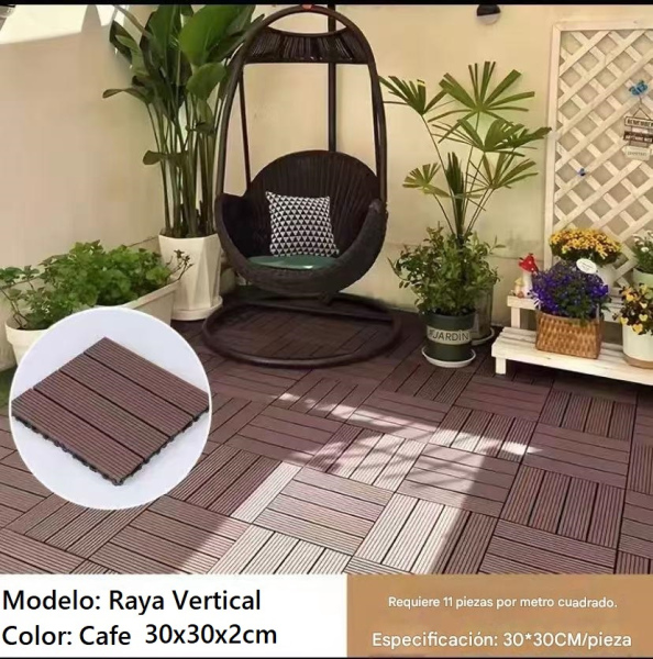 Baldosa encajable Rayas Verticales con base plástica fabricada en composite (de resina y madera de álamo) con acabado ranurado efecto madera en color Café, Gris y madera, perfecta para colocar en suelos de exterior como jardines y terrazas. Su superficie antideslizante aporta seguridad frente a resbalones y se instala de manera sencilla y rápida mediante sistema de encajado en clip.